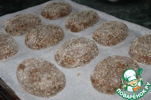 На противень расстилаем бумагу, обваливаем зразы в панировачных сухарях и выкладываем на противень.