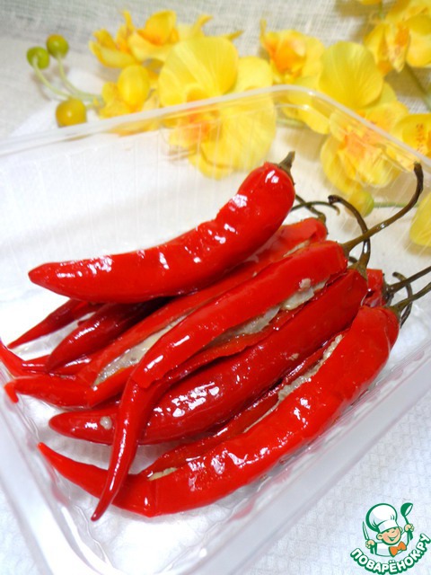 Описание: Viagra Naturale. Неделю назад прилетала в гости подруга. Из Италии. Сидели, смеялись, болтали о жизни под бокал хорошего итальянского вина и она рассказала моему мужу, большому любителю красного жгучего перца, о том, как ее свекр готовит из него закуску. Ну как тут не выспросить подробности? Но, к сожалению, подробностей она не знала. Открыли Интернет и нашли на одном итальянском сайте этот рецепт. Правда, мариновались там маленькие круглые перчики без хвостиков и начинялись баночным тунцом или селедкой. Рецепт я повторила в точности, только заменила круглый маленький перец на привычный длинный. И вот я представляю вам просто чумовую закуску к крепким напиткам - острый чили с селедкой. Ну а почему же Viagra Naturale, спросите вы? Отвечаю - так в Италии называют красный жгучий перец. Самое то для холодных и пасмурных осенних вечеров! ))