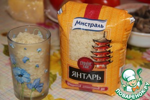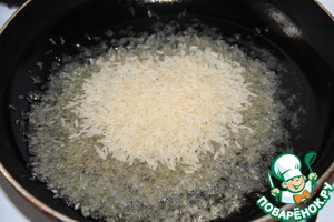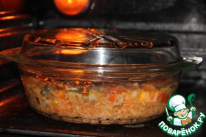Теперь берем посуду для духовки, у меня стеклянная утятница, и выкладываем в нее рис обжаренный