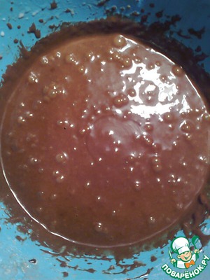 Затем к нашей шоколадной смеси добавила муку и разрыхлитель. Перемешала.