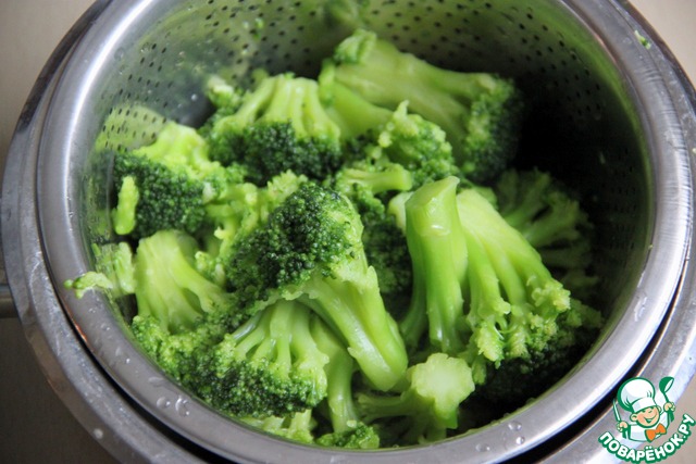 Брокколи разделить на соцветия (можно использовать замороженную заготовку) и бланшировать в подсоленном кипятке ок. 5 мин. Сцедить.