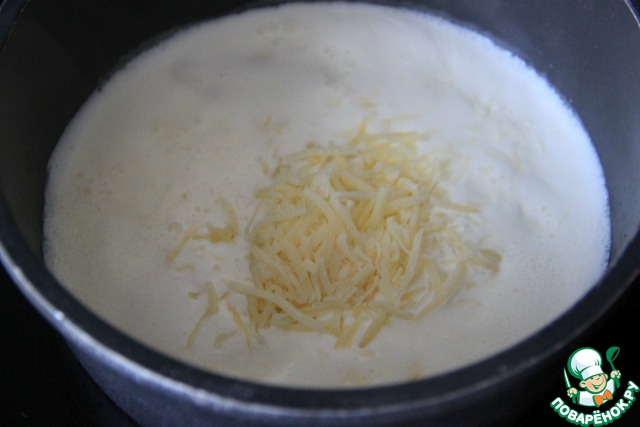 Подогреть сливки и добавить сливочный и твёрдый сыры, дать им расплавиться.
