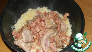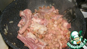 Со свиных ребрышек срезать жир, добавить в сковороду. Все как следует обжарить