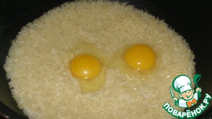 К рису добавить обжаренную колбасу с ребрышками, добавить мелко рубленные вареные яйца