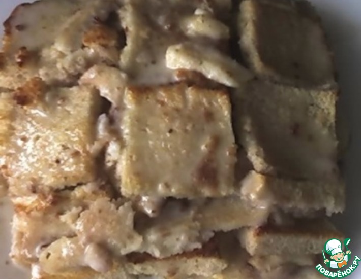 Тем временем хорошо смазываем противень, посыпаем его сухарями. Выкладываем половину смоченных ломтиков хлеба, сверху яблоки, посыпаем измельчёнными орехами и накрываем всё это оставшимся слоем смоченных ломтиков (сверху придавливаем руками или досочкой). Ставим в разогретую духовку примерно на 15 минут (до золотистой корочки).