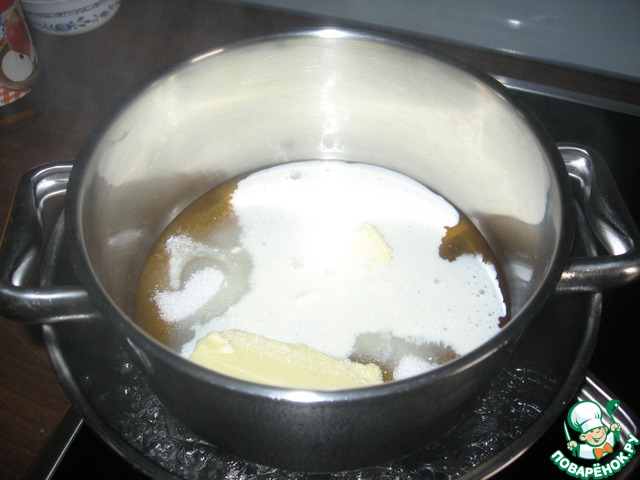 Смешаем Мед, сахар, масло и сливки в одном ковше.
