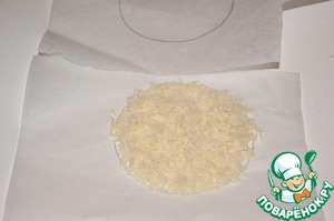 На листочке пекарской бумаги нарисовать круг диаметром 8 см., насыпать 1/6 часть сыра по всему кругу. -