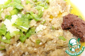 К мякоти баклажанов добавить лук, чеснок, паприку, соль, маслины (пасту), лимонный сок и 1,5 ст. л. оливкового масла. Перемешать.