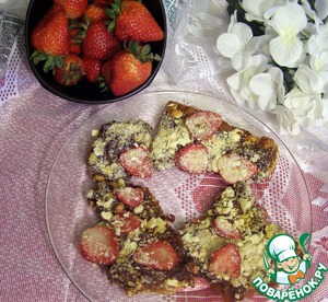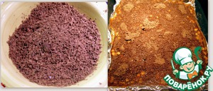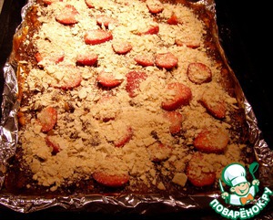 Посыпать на выпечку и на 2 минуты переместить в горячую духовку для того, чтобы присыпка пропиталась шоколадом и ягодами. Охладить и поставить еще охлаждать в холодильник, не меньше чем на 30 минут.