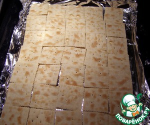 Духовку нагреть до 180 градусов, противень застелить фольгой и на него выложить крекеры. Вместо крекеров можно использовать сухой хлеб, тоненько нарезанный.