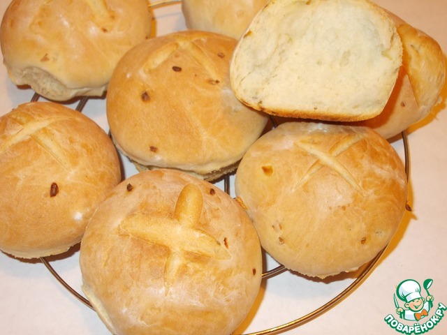 Сделать сверху на булочках небольшие крестообразные надрезы, смазать взбитым яйцом и поставить в разогретую духовку.