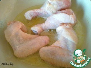 Берем нашу курочку (у меня были крылышки и голени), моем, сушим салфеткой. В сковороду наливаем немного масла и выкладываем курицу.