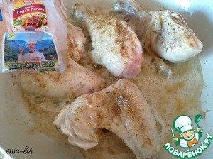 Минуты через 2-3 переворачиваем курочку, посыпаем приправами, солью (можно использовать любые приправы, у меня были адыгейская соль и смесь перцев). Так же через 2-3 минуты снова переворачиваем и посыпаем приправами. Продолжаем жарить, до золотистого цвета.