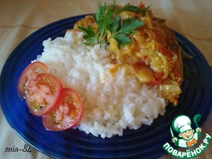 По истечение 15-20 минут все готово, можно подавать. Такая курочка хороша, как с гарниром, так и без. У меня гарниром был рис. Выкладываем курочку на тарелочки, украшаем зеленью и - к столу! Приятного аппетита!!!