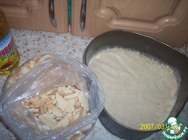 • Смазываем форму маслом и трем на терке печенье (я покупаю лом, он дешевле), высыпаем в форму и ровняем, толщина слоя - примерно 0,5 - 0,7 см.