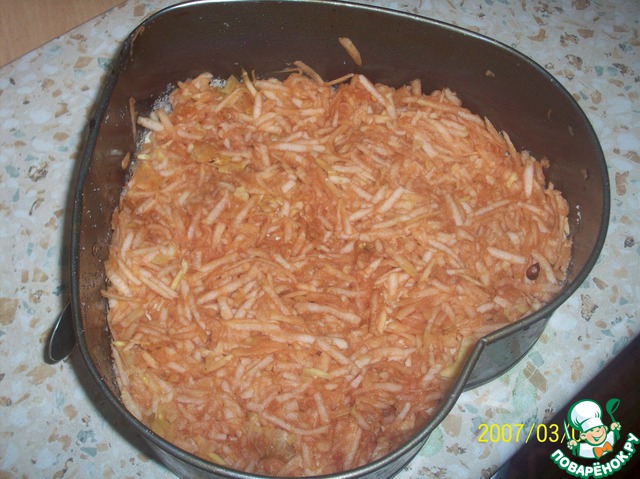 • Форму с пирогом переворачиваем на блюдо, пирог должен быть печеньем кверху.