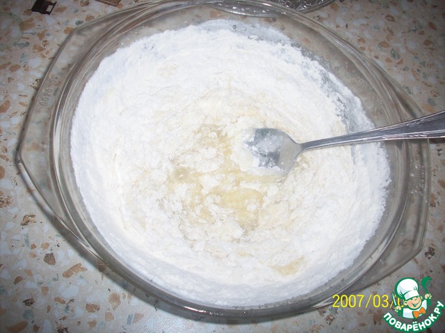 • Добавляем муку, я пользуюсь Пудовской самоподымающейся, и замешиваем тесто.