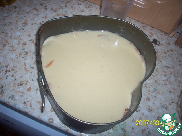 • Тесто выливаем на яблоки и ровняем ложкой.