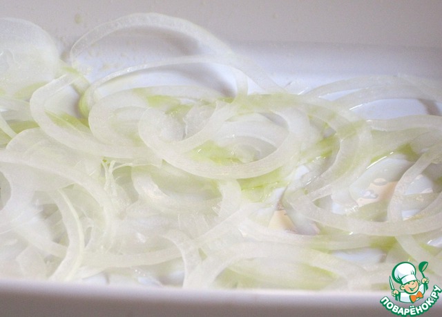 • Сбрызнуть маслом форму для выпечки и добавить первым слоем лук.