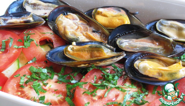Традиционный рецепт предвидит использование сырых моллюсков. Для того что бы открыть мидии я прогрела их всего полторы две минуты. Очищенные мидии как правило подвергаются более длительной предварительной тепловой обработке и так как все ингредиенты нужно еще запечь, мы рискуем превратить мидии просто в резиновые невкусные комочки. Если найдете сырые ощищенные мидии - попробуйте.