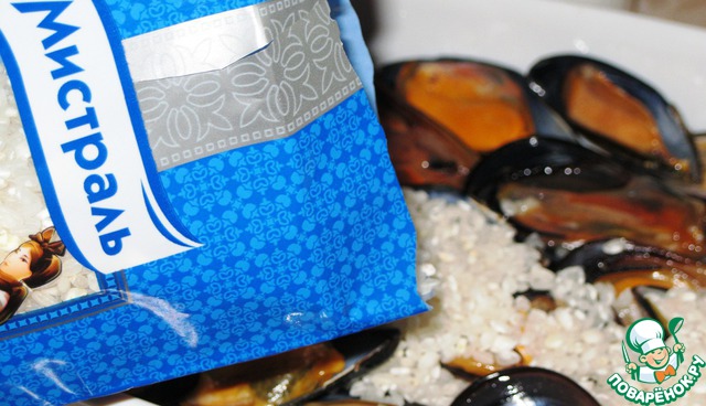 • Аккуратно засыпаем слой сырого риса "Италика" от Мистраль. Этот сорт замечательно подходит для этого блюда. Он послужит "связующим звеном" в текстуре и пропитается всеми вкусовыми нотами овощей и мидий.