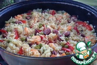 Можно и с рыбой попробовать. Или рис предварительно замочить на несколько минут - тогда сократится время приготовления и воду прежде чем заливать слегка подсолить придется (жидкость с мидий солоноватая).