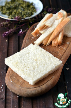 С хлеба для тостов срезать корочку, пройтись по нему скалкой.