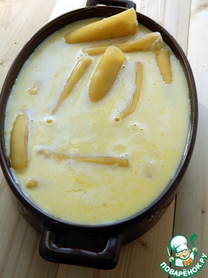 Яйца взбить с сахаром, ванильным сахаром, солью и молоком.