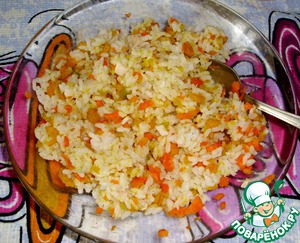Рис, тыкву, кальмара, морковь, сыр и 1 ст. ложку майонеза перемешать, при необходимости посолить и поперчить.