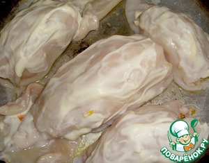 Выкладываем в противень, смазываем сметаной, накрываем фольгой, ставим в разогретую духовку 200*С и запекаем 15 минут, затем снимаем фольгу и запекаем еще минут 5 -10.
