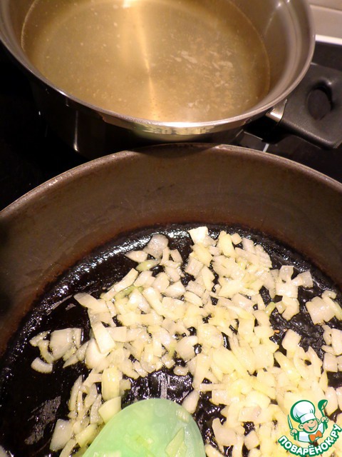 В сковороде на оливковом масле (1-2 ст. л.) обжариваем лук. Сковородку лучше взять побольше, т. к. рис значительно увеличится в объёме, и нам его нужно будет постоянно мешать.