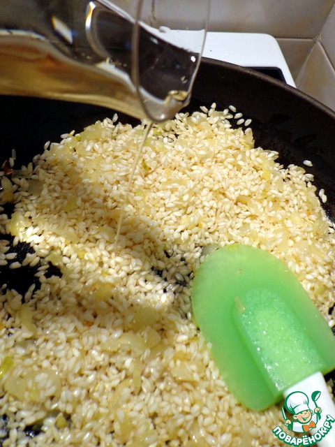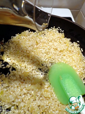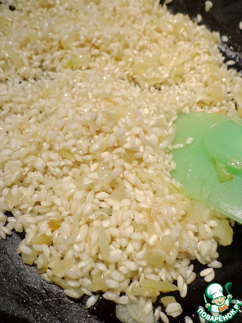 • Лук обжариваем до прозрачности, добавляем рис. Хорошо перемешиваем, чтобы каждое зёрнышко было окутано маслом.