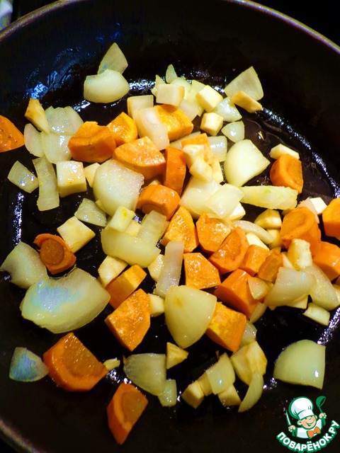 Морковь и 1 луковицу нарежьте крупными кусками, сельдерей кубиками 1 см - это для соуса.