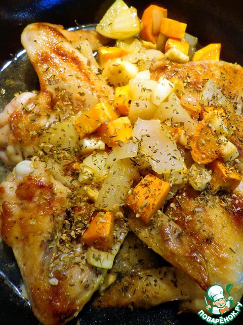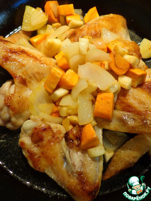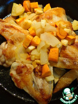 На горячей сковороде с оливковым маслом обжариваем овощи - лук, морковь, сельдерей - до румяности. Убираем овощи, обжариваем куриные крылышки тоже до румяности.
