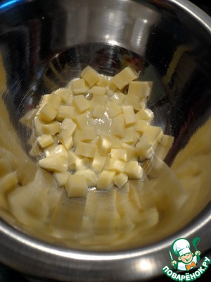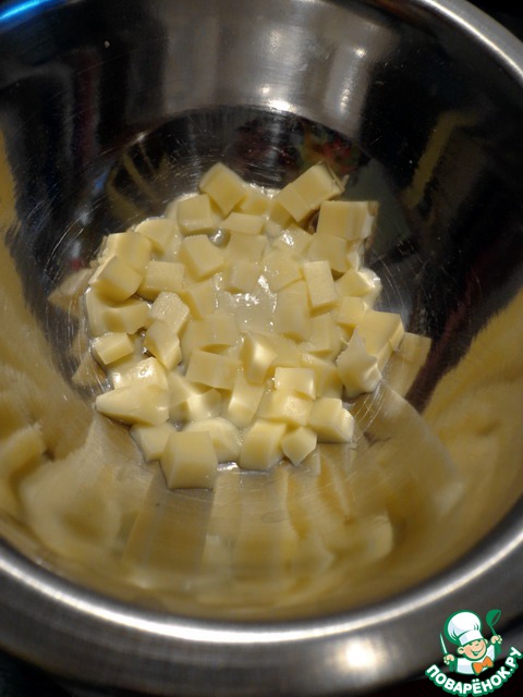 • Моцареллу (можно заменить другим мягким сыром) режем на кубики и растапливаем на плите.