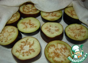 Баклажаны режем на кружочки, хорошо солим и заливаем кипятком на полчаса.