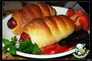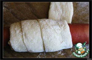 Сосиску кладем на полоску теста и по спирали оборачиваем. -