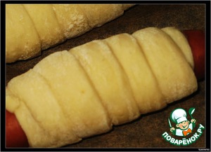 Раскатываем тесто до толщины 0,5 см, нарезаем на длинные полоски.