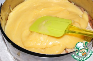 В кулинарное кольцо 22 см в диаметре поместить корж, по краю должен остаться небольшой зазор. -