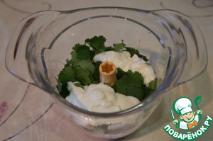 У кинзы оборвать листочки, сложить в измельчитель, добавить пару ст. л. сметаны и хорошо взбить.