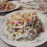 [+5]Вместо курицы у нас была свинина обжаренная, и слоями выкладывать салат мы не стали, а смешали все ингридиенты, получилось очень сочно и пряно!
