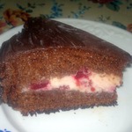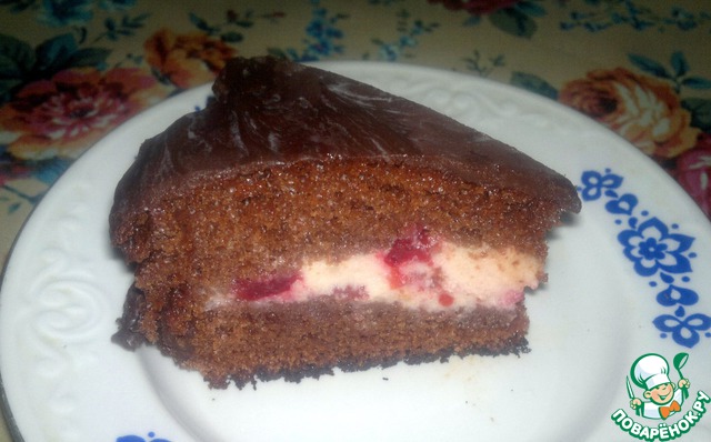 На фото торт с вишней в собственном соку. Торт покрыла покупным шоколадным кремом быстрого приготовления, а сверху шоколадной глазурью. К такому тортику никто не останется равнодушным!