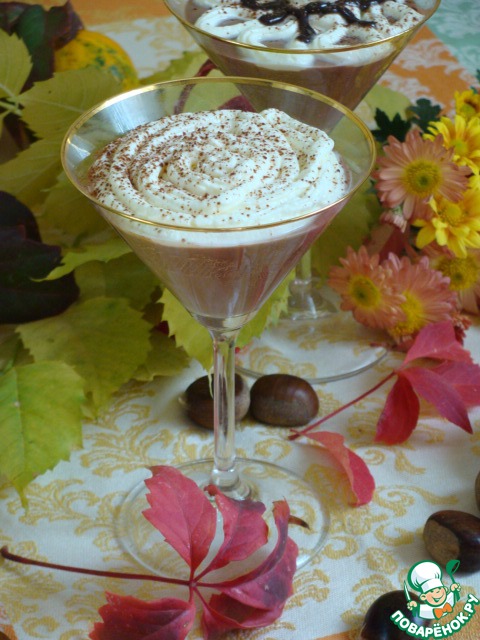 Сахарную пудру, какао-порошок и ром добавить в каштановое пюре и хорошо перемешать. Разложить пюре по креманкам.