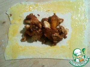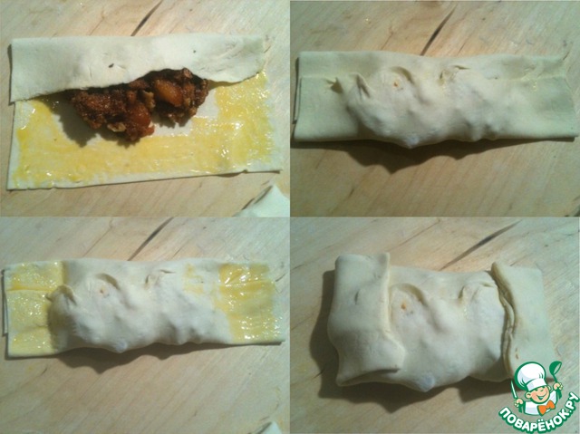 В центр положить немного начинки. Края теста смазать желтком, чтоб лучше склеивалось тесто. -