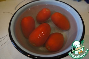 Помидоры надрезать крестообразно у плодоножки и залить крутым кипятком на пару минут, затем воду слить, обдать помидоры холодной водой и снять кожицу.