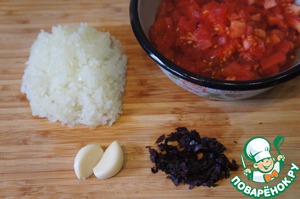 Снять листики базилика со стеблей, несколько листиков сохранить для украшения. Нарезать лук и помидоры мелкими кубиками. Чеснок очистить и разрезать вдоль на несколько полосок.
