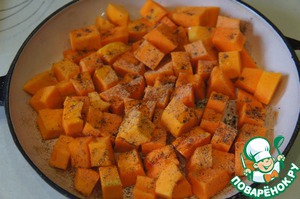Тыкву очистить от кожуры и семечек. Нарезать кусочками, выложить на противень, полить маслом и посыпать перцем и мускатным орехом. Поставить в разогретую до 200С духовку на 20 минут.