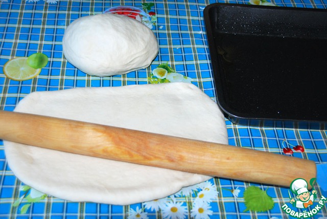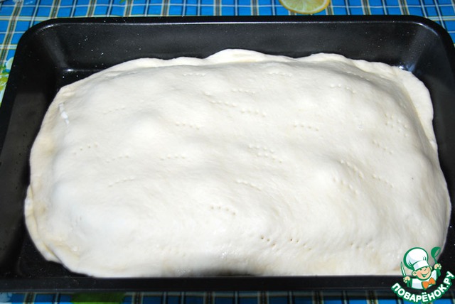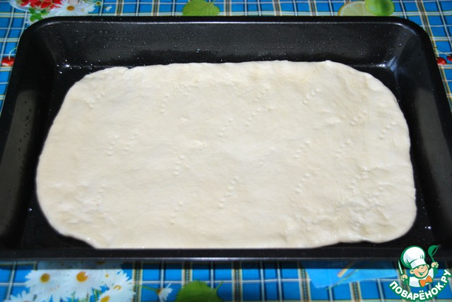 Тесто разделить пополам и тонко (около 0,5 см) раскатать по форме.