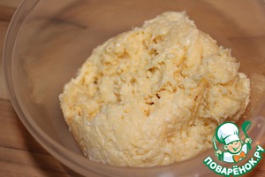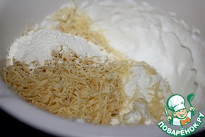 Холодные белки взбить до пиков, добавить натертый сыр и муку.