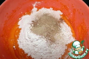 Добавляем муку, но не всю сразу, смотрим по консистенции теста, т. к мука разная и расход разный. Добавляем сюда же, ваниль, корицу, мускатный орех и имбирь. Перемешиваем всё хорошенько.